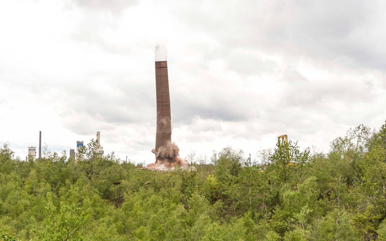 In Duisburg-Meiderich ist heute ein 120 Meter großer Abluftkamin einer ehemaligen Sinteranlagen gesprengt worden. Die Anlage befand sich auf dem Areal einer ehemaligen Schlackenhalde der Hüttenwerke Thyssen Stahl AG. 49 Kilo Sprengstoff brachten den 8500 Tonnen schweren Turm zum Fallen. Für die Sprengung mussten eine Bahnstrecke gesperrt werden, rund 200 Anwohner mussten während der Sprengung drinnen bleiben.