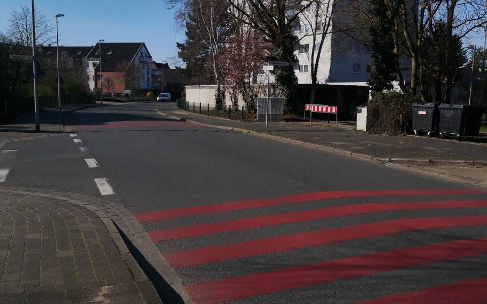 Sie sehen aus wie Zebrastreifen, sind aber keine: Rote Streifen auf der Kurt-Kräcker-Straße in Wesel-Fusternberg sorgen sowohl bei Autofahrern als auch bei Fußgängern und Radfahrern für Verwirrung.