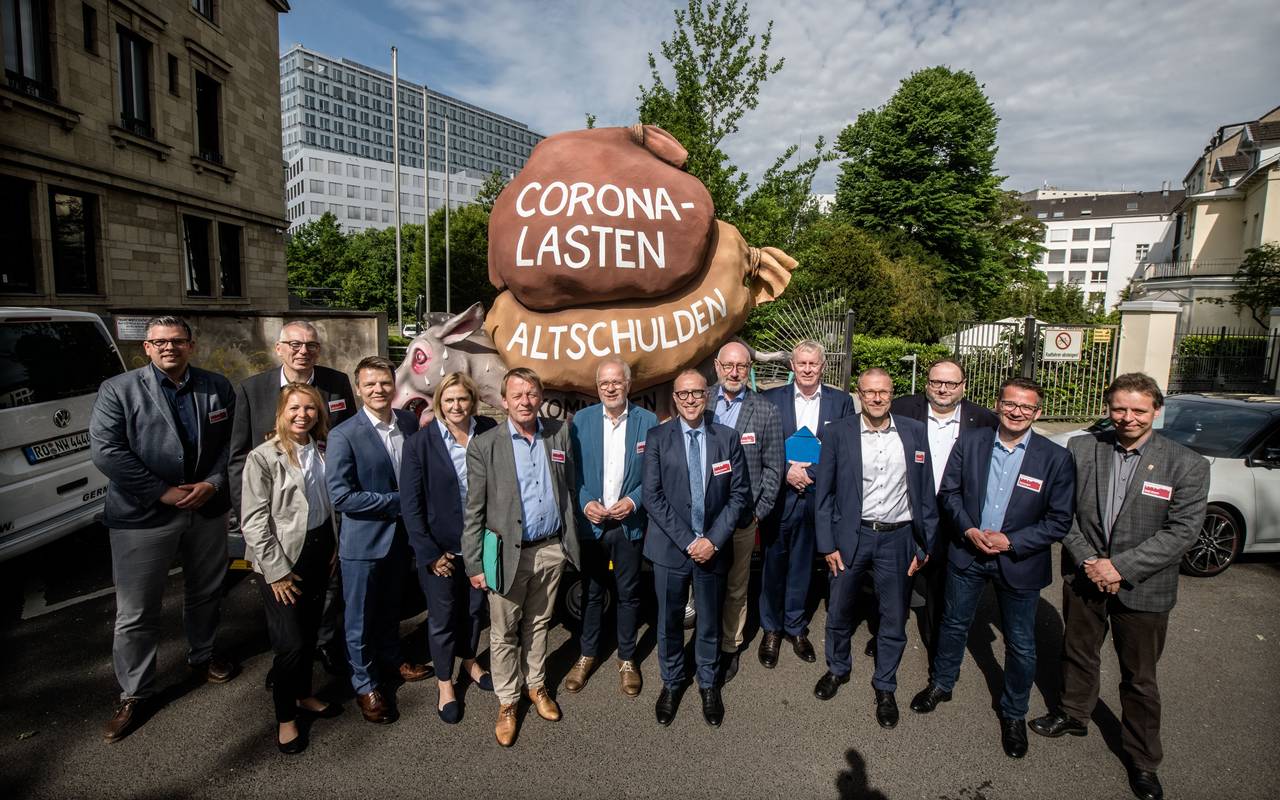 Vor dem Parteizentralen von CDU, FDP, SPD und Grünen in Düsseldorf waren heute auch die Bürgermeister aus Dinslaken und Voerde zum Protest. Die beiden Städte gehören wie auch Moers und Wesel einem Aktionsbündnis von Städten an, die strukturell benachteiligt sind - dadurch hohe Kosten beklagen und gleichzeitig wenig Steuereinnahmen haben. Sie fordern von den Parteien im Landtag eine schnelle Lösung für Altschulden und die Coronakosten. Für den Protest gab es auch einen Demo-wagen des Künstlers Jaques Tilly.