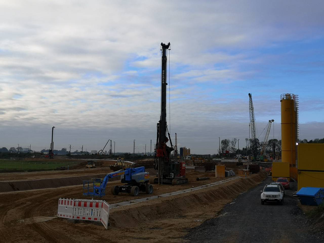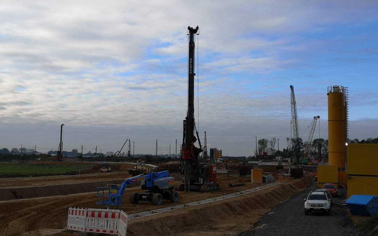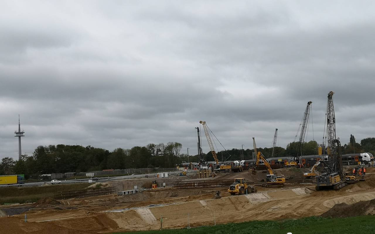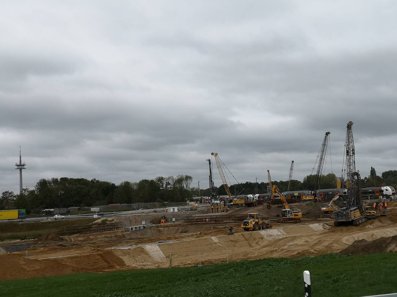125 Tonnen schwere Bohrpfahlgeräte, die 25 Meter tiefe Löcher bohren, Bagger in allen Variationen, Lkw und Planierraupen sorgen für ein regelrechtes Gewusel an der Baustelle. Bis zu 100 Menschen arbeiten aktuell in zwei Schichten. Bei Bedarf wird auf drei Schichtbetrieb umgestellt. Zum Beispiel um die baubedingte notwendige Sperrung der Bahnlinie im kommenden Jahr so kurz wie möglich zu halten.