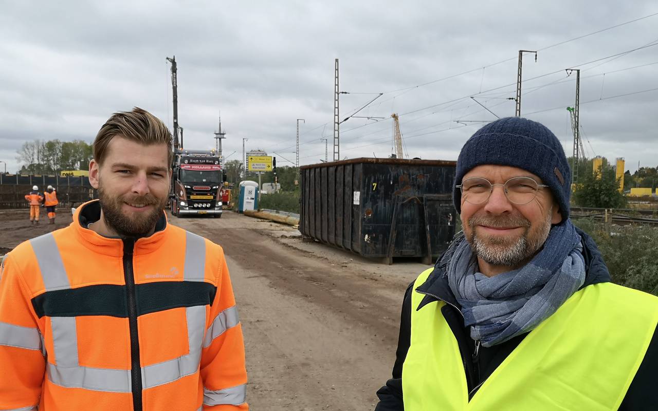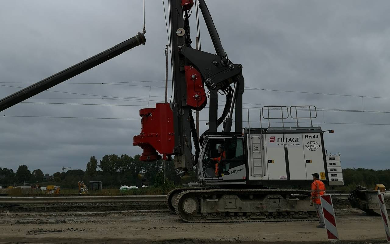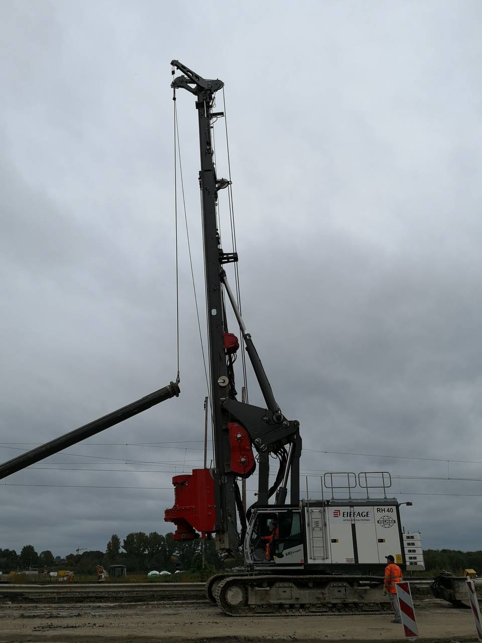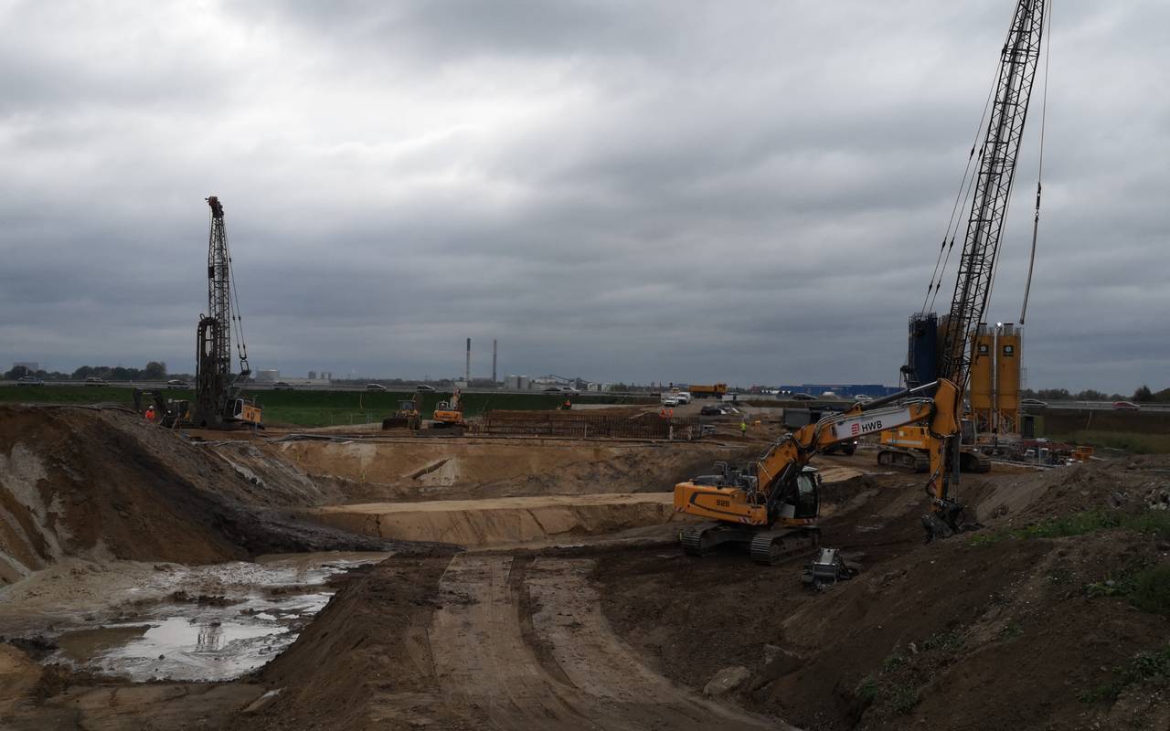 125 Tonnen schwere Bohrpfahlgeräte, die 25 Meter tiefe Löcher bohren, Bagger in allen Variationen, Lkw und Planierraupen sorgen für ein regelrechtes Gewusel an der Baustelle. Bis zu 100 Menschen arbeiten aktuell in zwei Schichten. Bei Bedarf wird auf drei Schichtbetrieb umgestellt. Zum Beispiel um die baubedingte notwendige Sperrung der Bahnlinie im kommenden Jahr so kurz wie möglich zu halten.