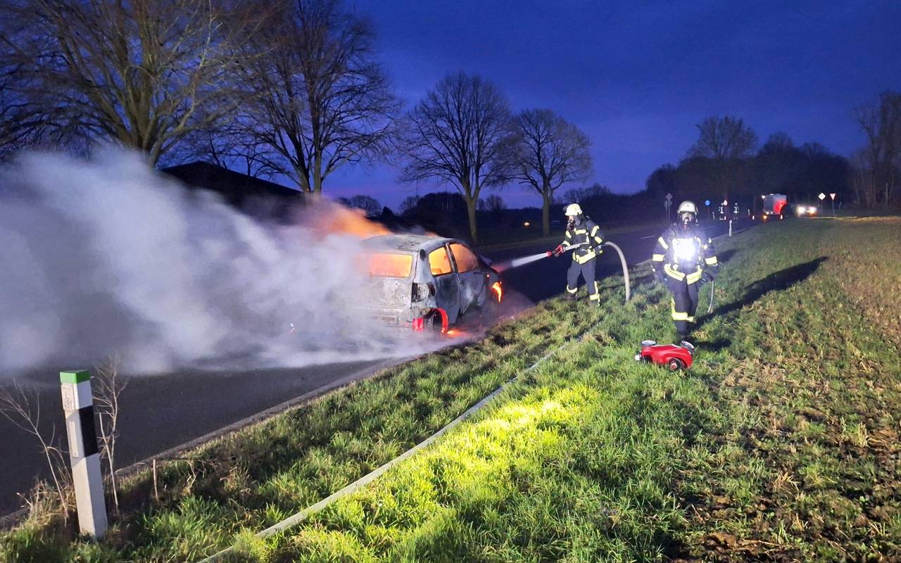 In Sonsbeck musste die Feuerwehr ein brennendes Auto auf der Alpener Straße löschen. Von den Insassen gab es keine Spur. Die Brandursache ist unklar.