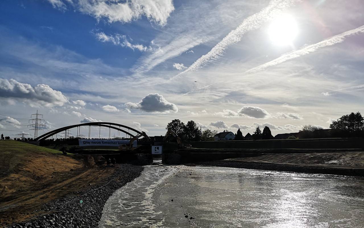 Durch die Sicherungsmaßnahmen unterhalb der ehemaligen Bahnbrücke fließt die Emscher hier so langsam, dass außer bei hohen Abflüssen auch eine Aufwärtswanderung von Fischen ermöglicht wird. Vorher wird allerdings noch nach möglichen Blindgängern aus dem 2. Weltkrieg gesucht. Im Anschluss daran werden dann Spundwände in den Boden eingebracht. Bis Ende des Jahres sollen alle Sicherungsmaßnahmen fertig sein.