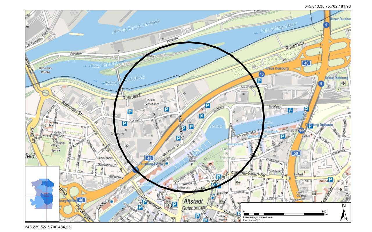 In Duisburg-Kaßlerfeld ist heute Mittag bei Bauarbeiten eine Bombe aus dem Zweiten Weltkrieg gefunden worden. Der Blindgänger liegt an der Straße „Am Unkelstein“ und soll noch heute Abend um 20 Uhr entschärft werden. Dafür müssen rund 1.400 Menschen ihre Wohnungen verlassen. Auch die A40 wird ab 19:30 Uhr zwischen dem Kreuz Duisburg und der Ausfahrt Duisburg-Häfen in beide Richtungen voll gesperrt. Erste Sperrungen in der Umgebung starten bereits um 18 Uhr. Es kann zu großen Verkehrsproblemen kommen.