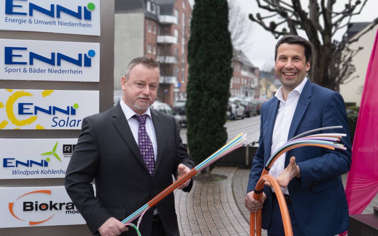 Der Breitbandausbau für Moers, Kamp-Lintfort, Neukirchen-Vluyn und Rheinberg startet im Frühjahr. Jetzt hat die Enni den Vertrag dazu mit der Telekom unterschrieben. In den nächsten 36 Monaten sollen weiße Flecken in den vier Städten beseitigt werden, los geht es in Moers und Neukirchen-Vluyn. Der Anschluss ans schnelle Netz ist in der ersten Ausbauphase kostenlos. 70 Schulen sollen profitieren. Das Projekt wird vom Land und dem Bund mit 28,7 Millionen Euro gefördert.
