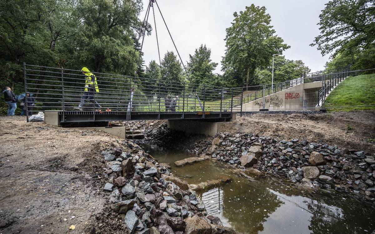 Im Moerser Schloss- und Freizeitpark ist die neue Brücke am Walldurchstich fast fertig. Im Sommer war sie mit einem großen Kran über dem Moersbach installiert worden. Jetzt sind nur noch letzte Arbeiten am Geländer nötig, Anfang März soll die Brücke dann laut Stadt freigegeben werden. Auch die Zuwege sollen dann fertig sein. Mit der Brücke wird außerdem der beliebte Weg durch den Walldurchstich wieder geöffnet. Die Arbeiten sind Teil der umfangreichen Umgestaltung des Schloss- und Freizeitparks in Moers. 2021 war sie gestartet, bis 2027 sollen sie dauern.