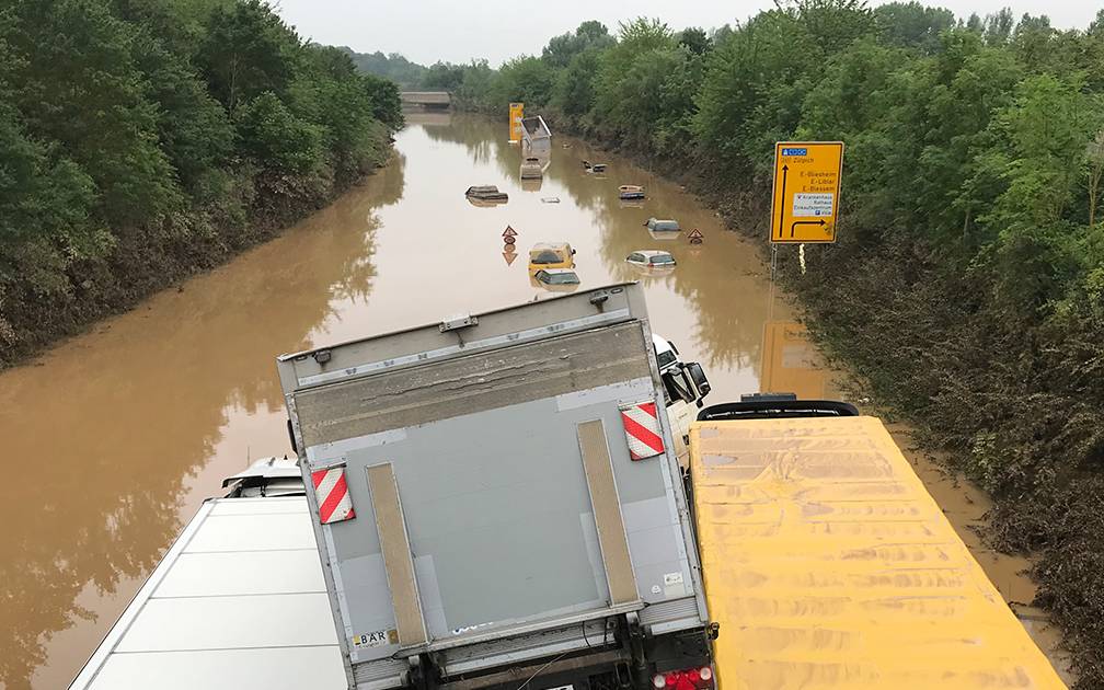 Das Ausmaß der Schäden wird allmählich deutlicher. Im besonders schwer getroffenen Erftstadt-Blessem hat ein gewaltiger Erdrutsch Gebäude, Straßen, auch einen Teil der Autobahn 1 weggespült, mehrere Menschen sind ums Leben gekommen.