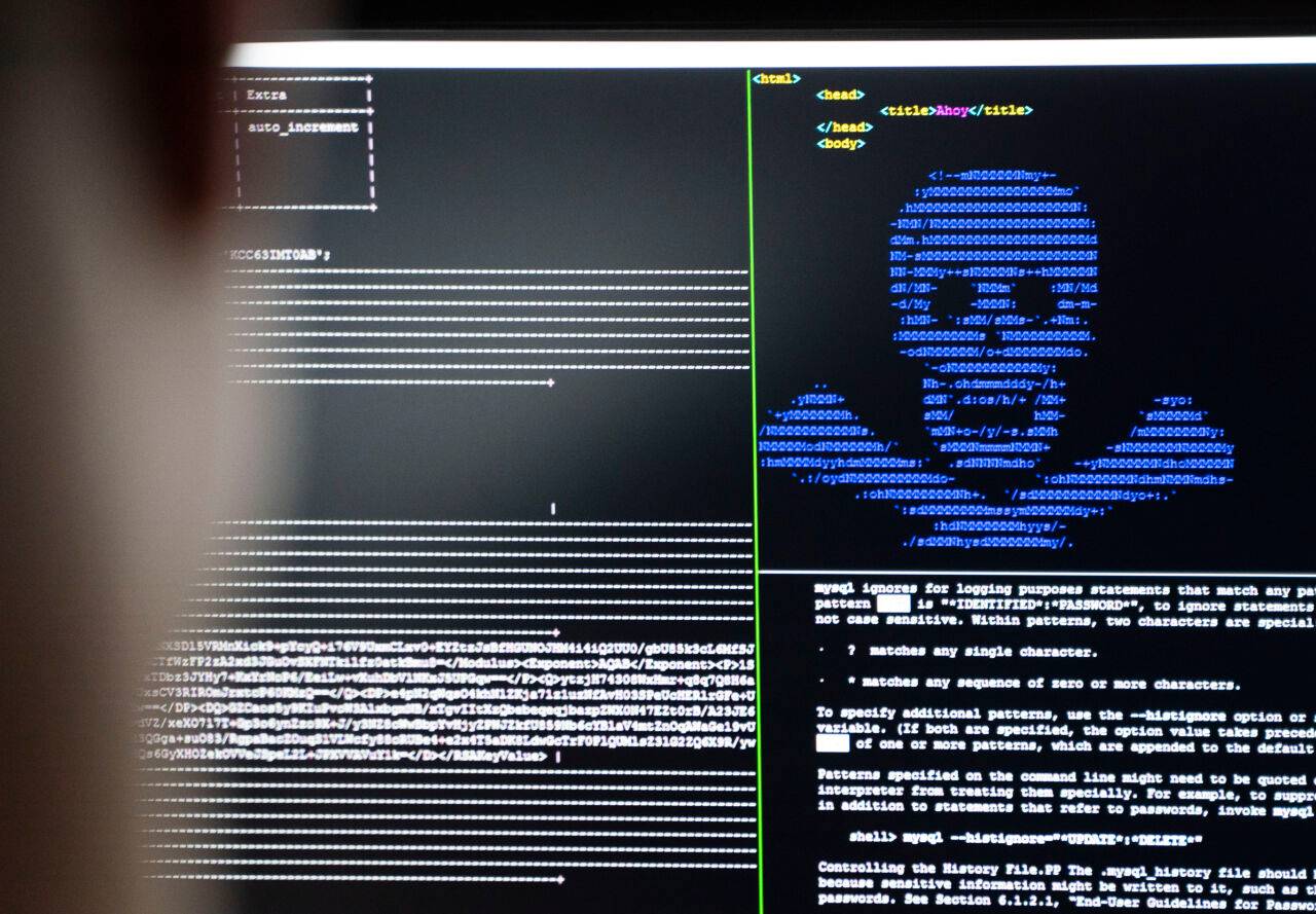 Die Cyberkriminalität erklärt am Symbolbild mit einem Computer, auf dem ein Totenkopf erscheint