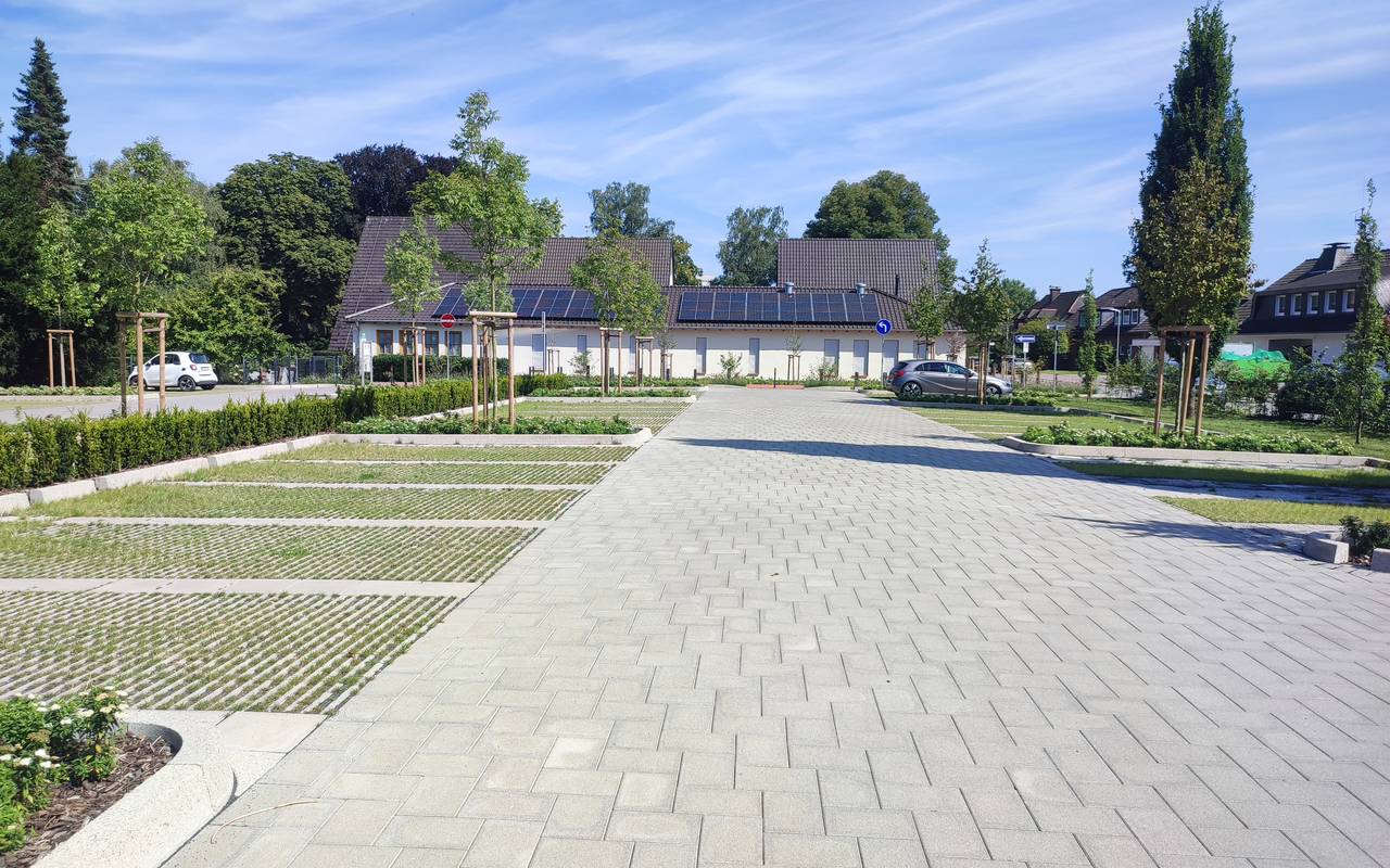 Die Stellplatzanlage in Dinslaken vereint ökologische und klimatische Aspekte: Das Regenwasser versickert direkt vor Ort, die Stellplatzflächen sind begrünt und sind von Hecken und alten und neuen Bäume umgeben, die Schatten spenden. Auch für Menschen, die zu Fuß oder mit dem Fahrrad unterwegs sind, hat sich die Situation verbessert. Der Fuß- und Radweg verläuft jetzt klar getrennt von der Auto-Einfahrt. Das erhöht die Sicherheit. Außerdem wurde entlang des Weges eine Beleuchtung angebracht. Neu hinzugekommen sind zudem Abstellmöglichkeiten für Fahrräder und Ladepunkte für E-Bikes.