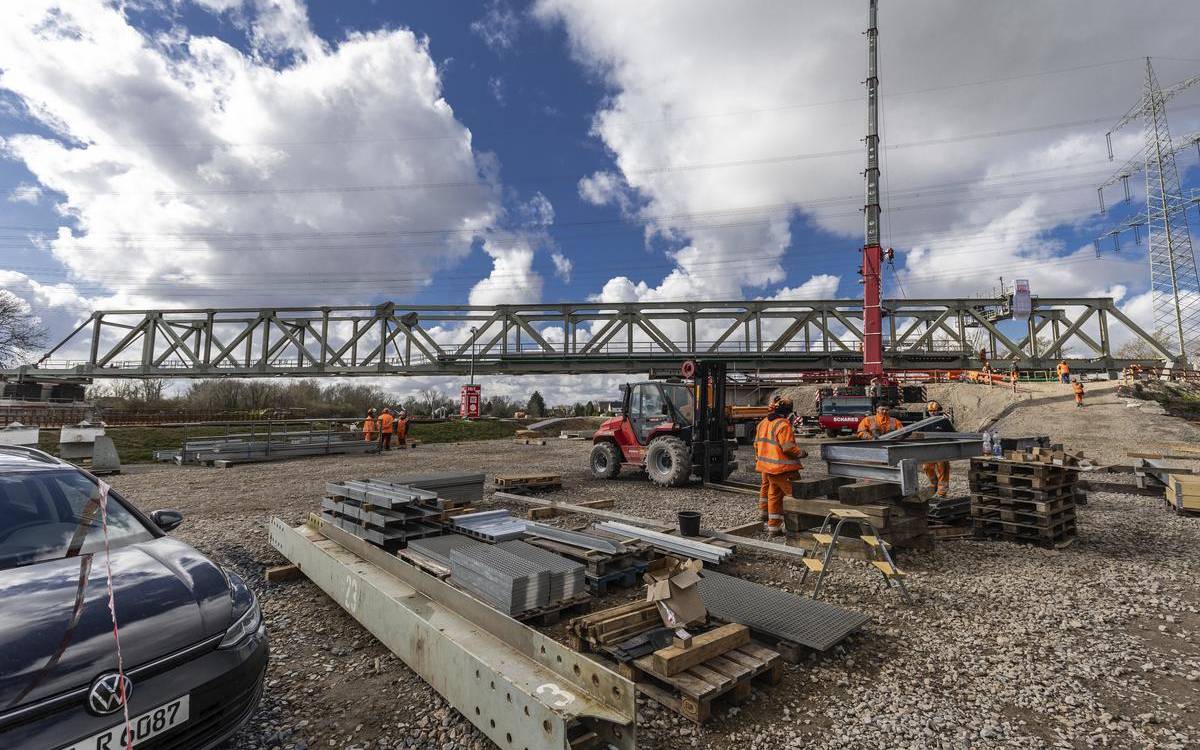 Die Hilfsbrücke über die Emscher in Dinslaken soll noch in dieser Woche ihre endgültige Position erreichen. Ab dem 16. April sollen dann auch die Züge wieder darüber rollen können.
