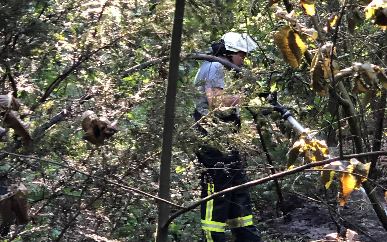 65 Einsatzkräfte verhindern Übergreifen der Flammen auf andere Bäume. Waldbrandgefahr steigt bei Trockenheit an.