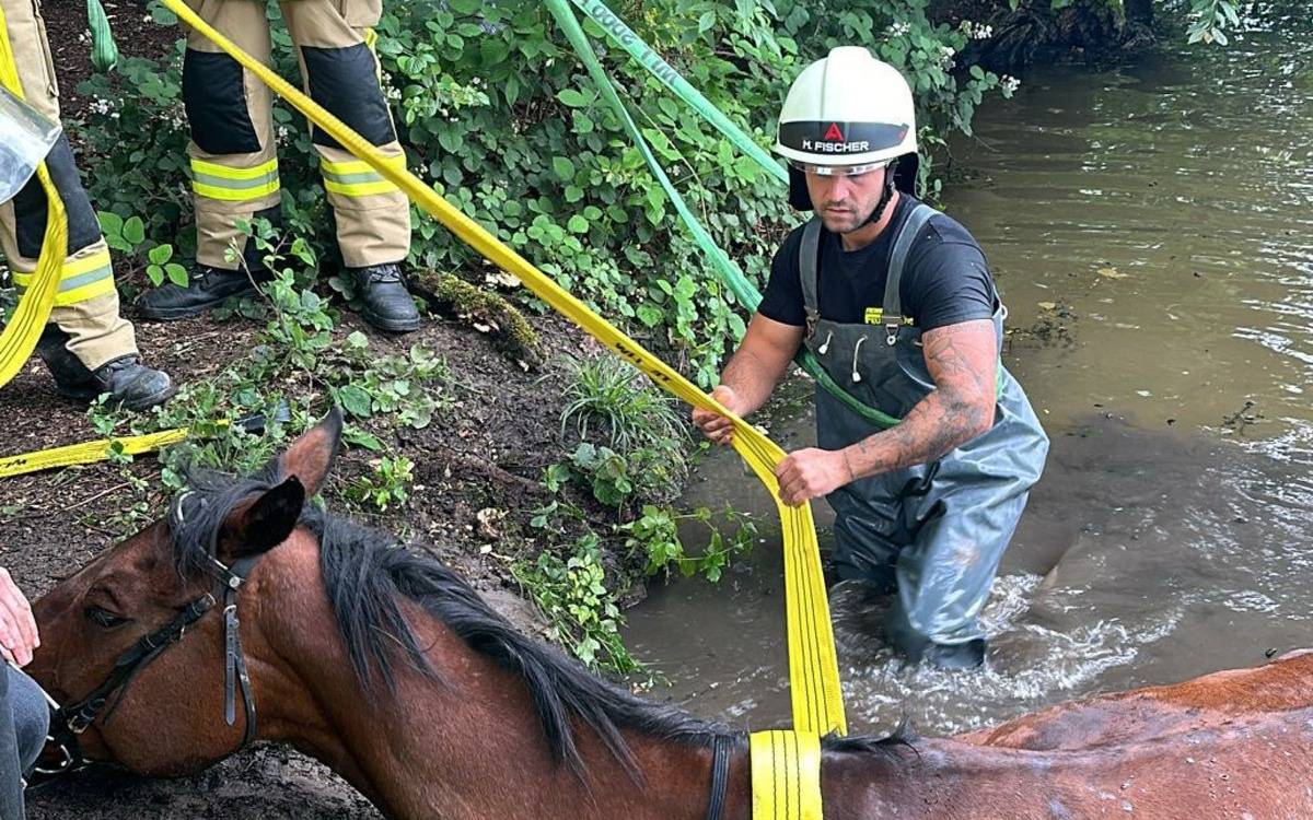In Rheurdt hat sich das Pferd "Showtime" am Wochenende in eine missliche Lage gebracht. Einsatzkräfte aus Vluyn und Rheurdt konnten es zum Glück aus dem Wasser ziehen.