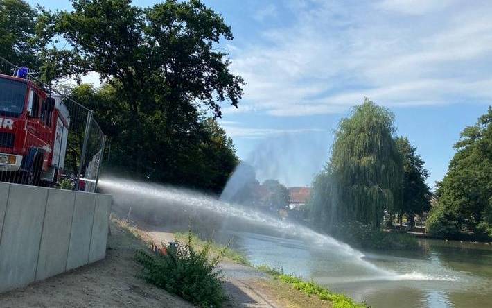 In Gahlen war der Mühlenteich so aufgeheizt, dass den Fischen der Sauerstoff ausging. Die Schermbecker Feuerwehr erwies sich als Retter und sorgte für Wasseraustausch.