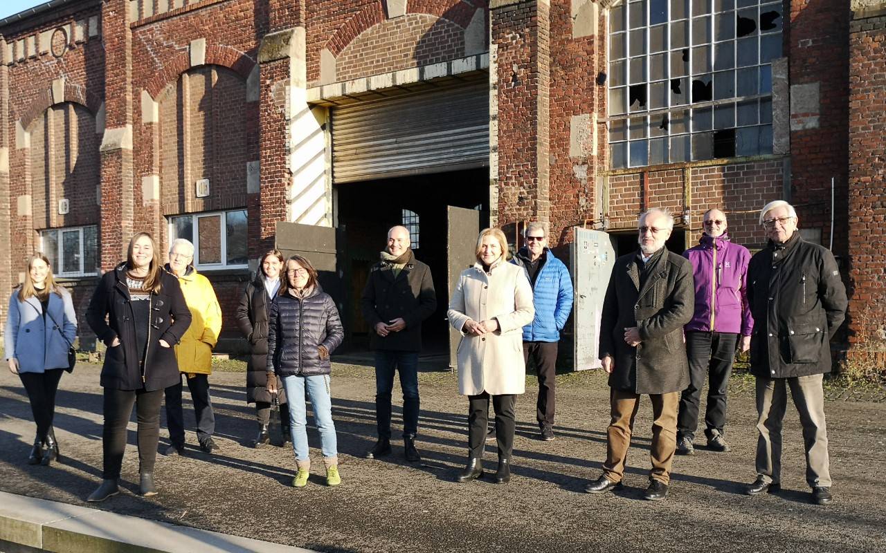 Strahlende Gesichter bei strahlendem Sonnenschein an der Zechenwerkstatt in Lohberg. Die Initiative Zechenwerkstatt hat einen Förderbescheid von 5 Millionen Euro bekommen. 3,5 Millionen kommen vom Land NRW, den Rest trägt die Stadt Dinslaken, die auch die Halle gekauft hat. Per Erbpachtvertrag kann die kann die Initiative die Halle nun 66 Jahre mit Leben füllen. Die Sanierung der Außenhülle (Dach, Mauerwerk, Stahlträger, Fenster, Türen und Tore) soll 2023 beginnen und wird bis mindestens Ende 2024 dauern. Die Innenrenovierung muss aus Eigenmitteln gestemmt werden.