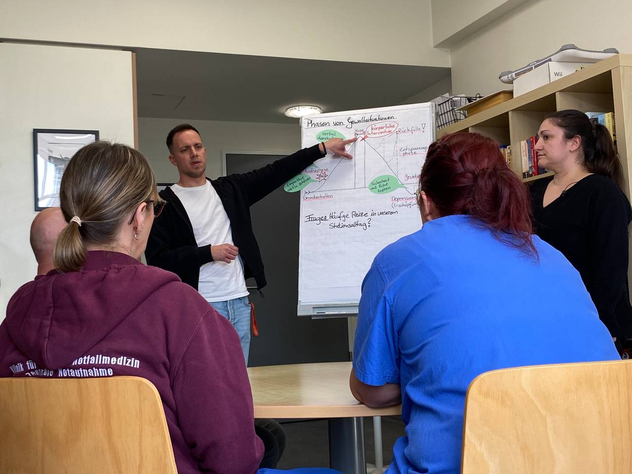 Wer aber Action, Rollenspiele und Karate-Skills sucht, ist im Deeskalationstraining falsch. In dem Kurs geht es vielmehr darum, Situationen so zu meistern, dass sie erst gar nicht eskalieren. Auf Details achten, das ist Trainer Dennis von Heesen ganz wichtig. Hat der Patient eine Lieblingsband? Einen Fußballverein? “Oft sind es keine großen Formeln, sondern ganz viel Einfaches aus dem Alltag.” Oft habe man allein durch etwas Smalltalk aufgeheizte Situationen beruhigen können - mit Empathie gehe vieles, sagt Dennis.