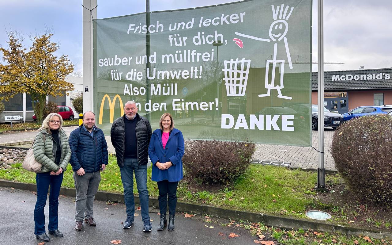 Jetzt tut sich was. Gemeinsam mit McDonald’s will die Stadt Dinslaken die Müllsituation verbessern. Ein großer Schritt: Direkt an der Zufahrt des Restaurants hängt jetzt ein Spannbanner. „Frisch und lecker für dich, sauber und müllfrei für die Umwelt!“ steht darauf. Eine klare Botschaft, die die Kunden daran erinnern soll, ihren Müll in die vorhandenen Mülleimer zu werfen.