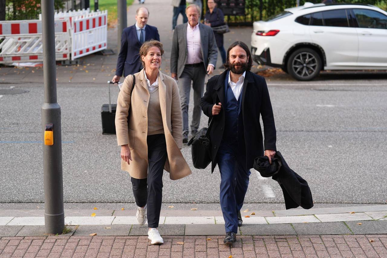 Unternehmerin Block (links) und ihr Verteidiger Bott (rechts) laufen zum Landgericht. © Marcus Brandt/dpa