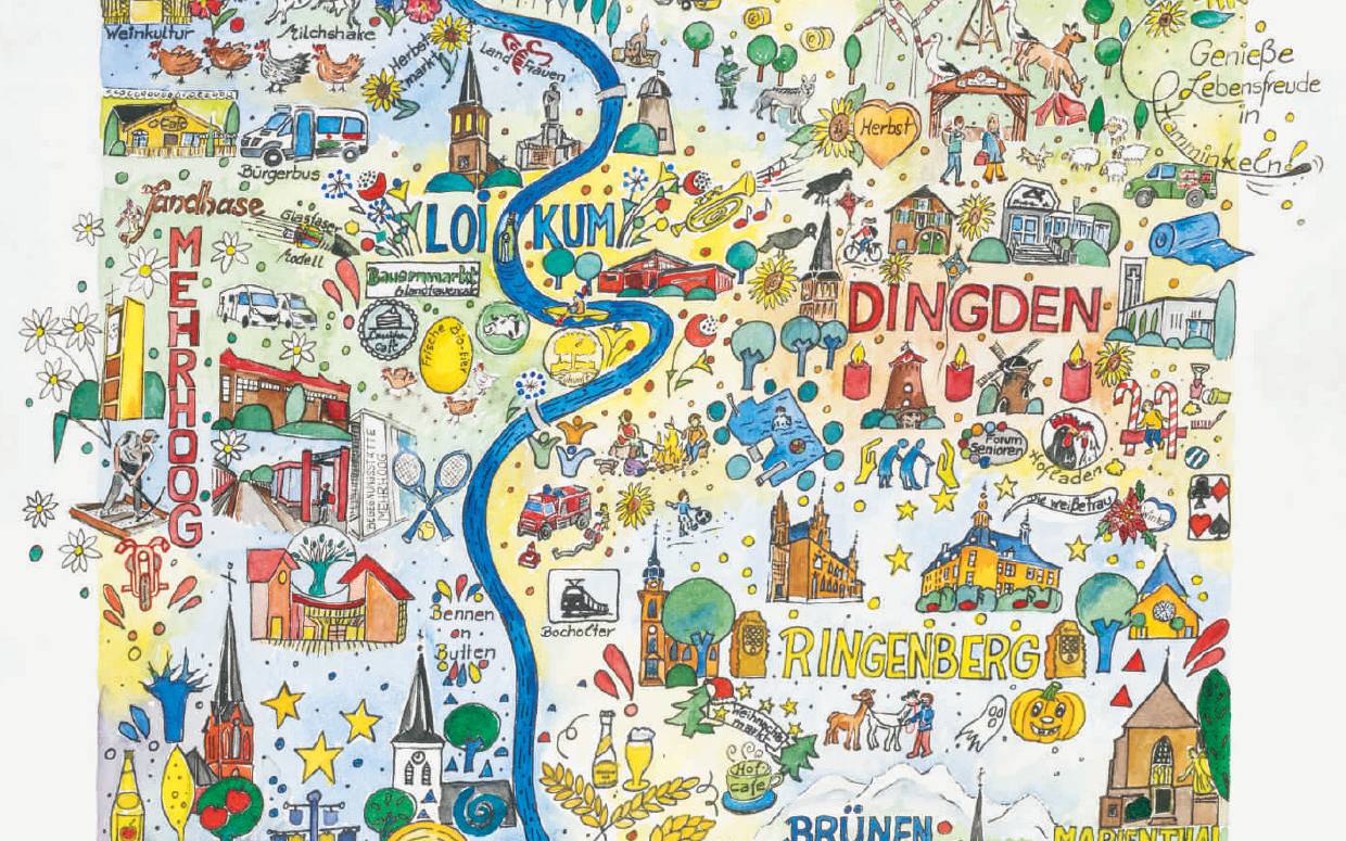 Kirchen, Kühe, Kloster und jede Menge andere Details aus sieben Dörfern - Hamminkeln hat jetzt sein eigenes Wimmelbild. Für 12 Euro kann es gekauft werden.