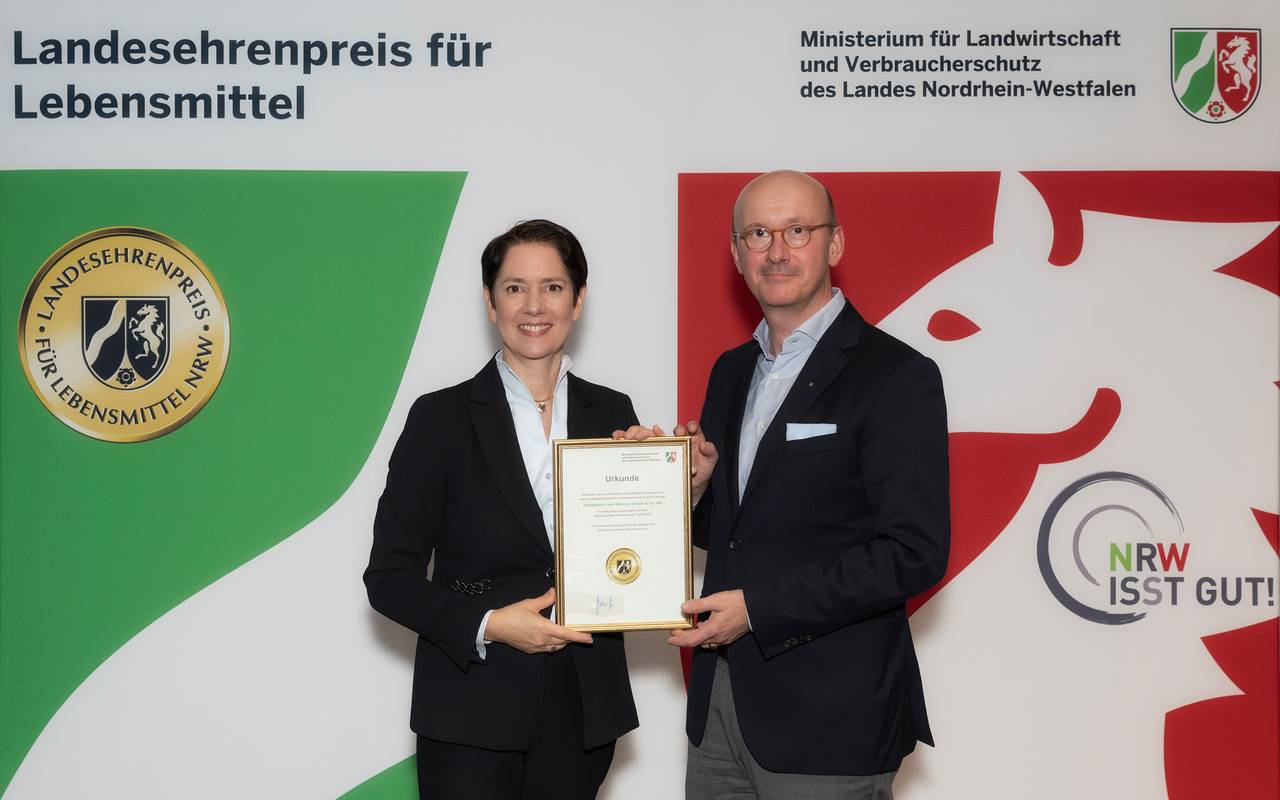 Die Obstkelterei van Nahmen aus Hamminkeln hat den Landes- und den Bundesehrenpreis für ihre Säfte erhalten. Im Juni hatte die Deutsche Landwirtschafts-Gesellschaft (DLG) elf Saftkreationen des Familienunternehmens aufgrund bester Testergebnisse in den Qualitätsprüfungen ausgezeichnet. zwei Mal mit Bronze, einmal mit Silber und stolze acht Mal mit der Gold-Medaille. In der Folge bekam der Safthersteller am 11. Oktober 2022 in Berlin mit dem vom Bundesministerium für Ernährung und Landwirtschaft die höchste Ehrung zugesprochen, die ein deutsches Unternehmen der Ernährungswirtschaft für seine Qualitätsleistungen erhalten kann. Doch damit nicht genug: Am 14. November verlieh die NRW-Ministerin für Landwirtschaft und Verbraucherschutz, Silke Gorißen, der Saftkelterei van Nahmen im Düsseldorfer Maxhaus den Landesehrenpreis für Lebensmittel.