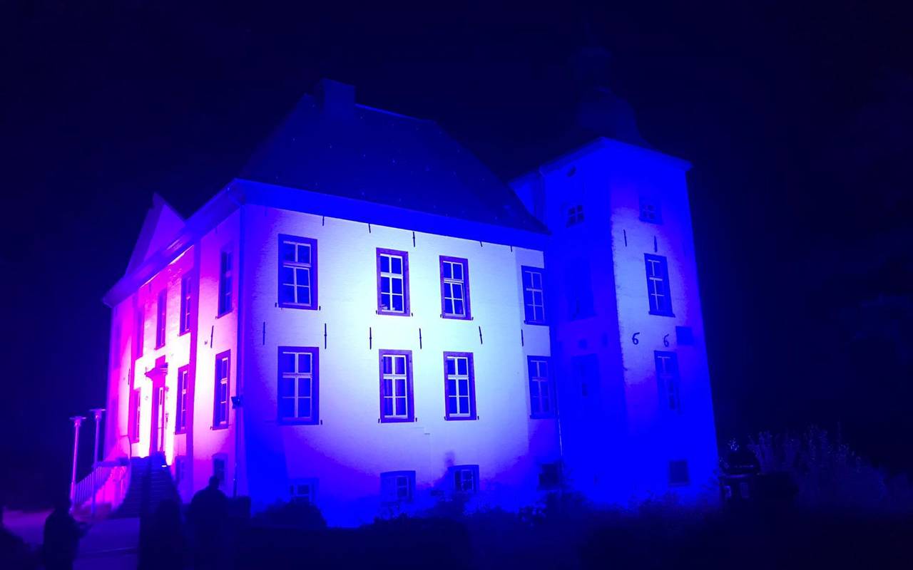Am Samstag, 04.Mai wird das Wasserschloss Haus Voerde ab 19 Uhr Blau und lila leuchten. Leuchten für Huntington. Dazu gibt es ein Begleitprogramm.