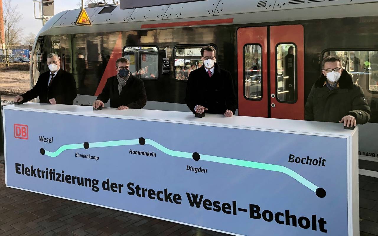 Schon seit einer Woche fahren die Züge zwischen Wesel und Bocholt wieder. Doch heute wurde die Strecke vom Ministerpräsidenten Hendrik Wüst (CDU) offiziell eröffnet. Ebenfalls beim symbolischen Knopfdruck zur Eröffnung waren Roland Pofalla, Infrastrukturvorstand der Deutschen Bahn, Joachim Künzel vom Nahverkehr Westfalen-Lippe und Ronald Lünser vom Verkehrsverbund Rhein-Ruhr. Insgesamt hat die Elektrifizierung des Abschnittes rund 50 Millionen Euro gekostet.