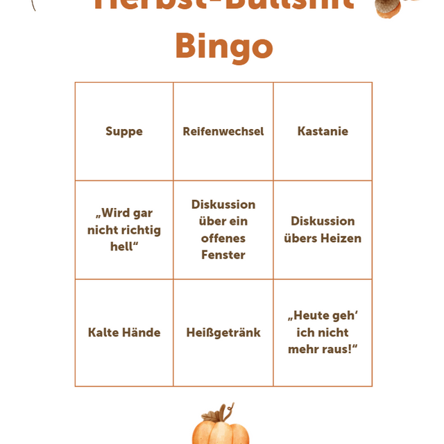 Da ist er: Der Herbst! Und mit ihm seine ganz eigenen Small-Talk-Themen, die uns in der Kaffeeküche, bei Tante Inge und beim Friseur erwarten. Deshalb gibt es von uns für euch das ultimative Herbst-Smalltalk-Bingo!