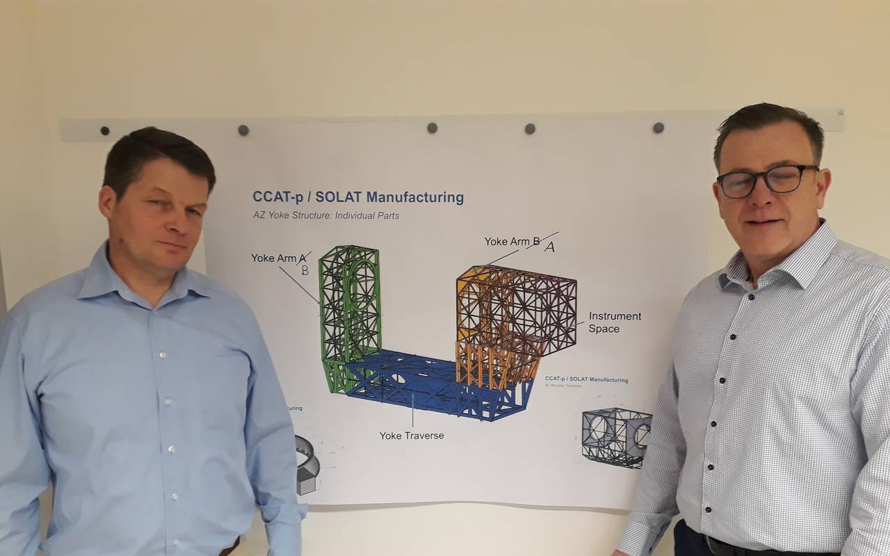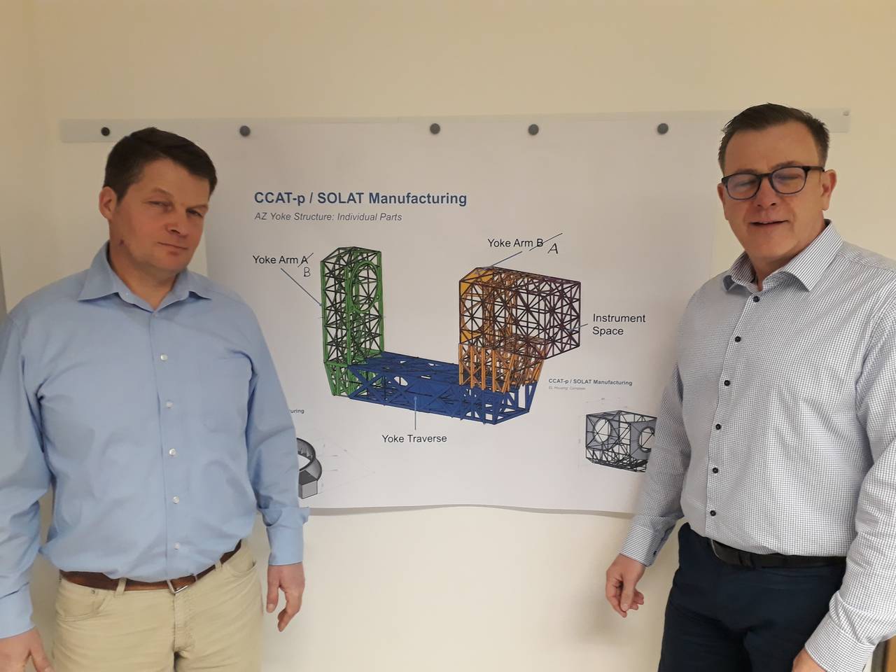 25 Meter Länge, 8 Meter Tiefe und 20 Meter Höhe. Riesige Teleskope der Firma Wessels aus Xanten sollen in der chilenischen Attacama - Wüste helfen die Entstehung des Alls zu verstehen. Der Auftrag kommt von der Firma Vertex Antennentechnik aus Duisburg, die die Teleskope geplant haben. Bei Zeichnung und Fertigung ist höchste Präzision gefragt, denn schliesslich darf nichts ruckeln und keine Materialausdehnung die unvorstellbare Meßgenauigkeit beeinflussen. Das Teleskop hat einen gemittelten Fehler über die Oberfläche in der Größe eines Viertels eines menschlichen Haares. Die Genauigkeit wird in Bogensekunden gemessen, eine Bogensekunde ist ein 3600Hunderstl Grad - für Nichtmathematiker kaum vorstellbar. So sollen aufgefangene Wellen und Strahlen Aufschlüsse zur Enstehung des Universums geben.