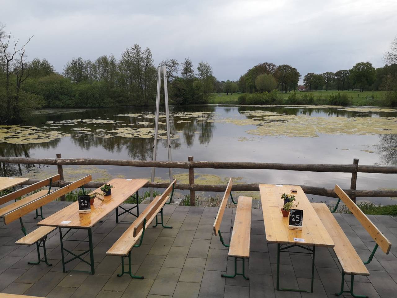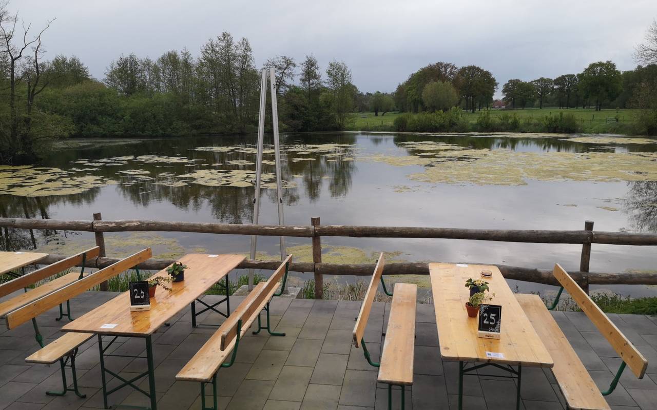 Angeschlossen an dem Hofladen ist seit kurzem ein eigenes Hofcafé, in dem 30 Gäste Platz finden. Noch idyllischer ist es auf der Terrasse mit 80 Sitzplätzen am eigenen Weyer. Neben den Wasservögeln lassen sich ab und zu sogar Rehe blicken.