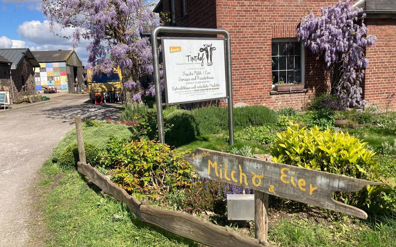 Auf dem Tinthof in Voerde-Spellen leben aktuell (Stand 18.04.24) 35 Milchkühe mit ihren 10 Kälbern. Das die Kälber mit ihren Müttern zusammenleben dürfen ist eher selten, weil sie dann ein Drittel bis 50 Prozent der Mutter-Milch trinken, die dann nicht mehr in den Verkauf gehen kann. Aus der übrigen Kuh-Milch macht Inhaber Christian Hülsermann eigenen Käse in den verschiedensten Sorten, Joghurt und natürlich Rohmilch. Außerdem gibt es im Hofladen des Tinthofs Eier von Hühnern hier vom Hof, aber auch Produkte von den Kollegen aus der Region, saisonales Gemüse, Honig oder Bier von den Kollegen vom Brauprojekt 777. Dazu wird das Sortiment durch eine Unverpackt-Ecke mit alltäglichen Bedarfslebensmitteln wie Salz, Zucker, Mehl und Nudeln ergänzt, aber auch Putzmittel finden sich im Laden. Hier bekommt man alles, was man so braucht, nur nicht in Massen. Mehr Infos zum Tinthof findet ihr hier.