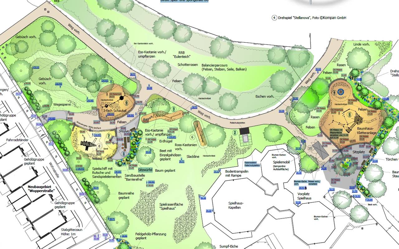 An der Wupperstraße in Kapellen wird ein neuer Treffpunkt mit Spielgeräten und viel Grün eingerichtet. Geplant sind u.a. Spielschiff, Kletterbaumhaus, Picknickplatz oder Slackline.
