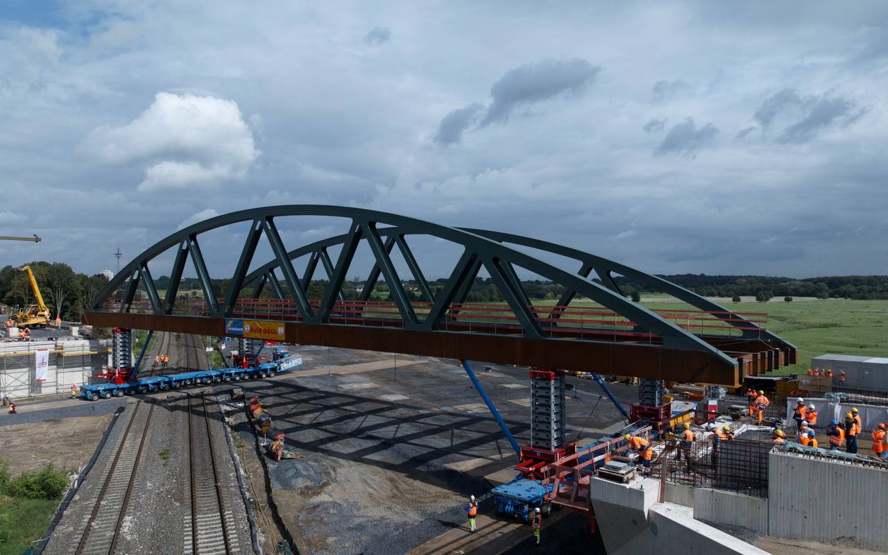 Die neue B8-Brücke in Wesel erreicht heute ein wichtiges Etappenziel. Das 800 Tonnen schwere Bauwerk wurde ab 7 Uhr 30 aufwendig an seinen Platz geschoben. Der Vorgang hat inklusive Vorbereitungen mehrere Stunden gedauert. Auf Höhe des Lippeschlösschens konnte der Einschub von einer Plattform aus beobachtet werden. In den letzten Monaten ist die Brücke schon zusammengebaut worden. Nötig ist sie, um Platz für das dritte Gleis auf der Betuwe-Güterzugstrecke zu schaffen.