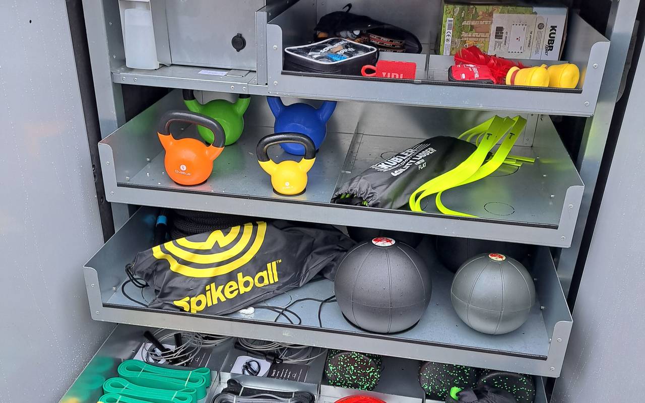In einer Sportbox am Kamp-Lintforter Pappelsee gibt es jetzt viel Zubehör zu mieten - für sportliche Spiele oder auch Kraftübungen. Benutzt werden kann es kostenlos per App.
