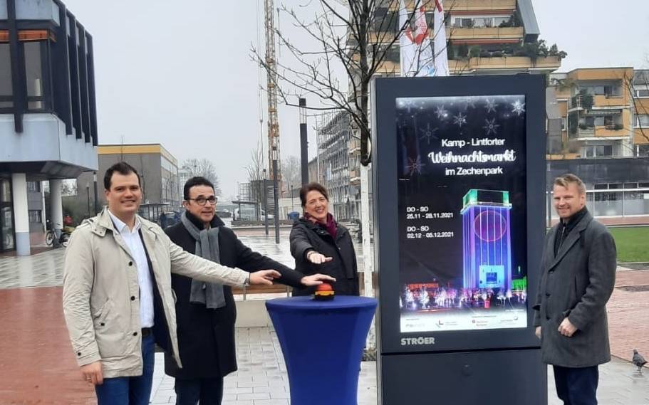 Statt zerfleddeter alter Papier-Werbeplakate gibt es ab sofort in der Kamp-Lintforter Innenstadt drei neue digitale City-Screens. Auf den großen LED-Bildschirmen bekommen die Menschen in der Fußgängerzone neben Werbung auch Nachrichten aus der Stadt und sogar Verkehrsinfos und Warnhinweise angezeigt. Bürgermeister Landscheidt freut sich über das neue Infomationsangebot, denn wichtige Neuigkeiten kommen jetzt klarer bei den Fußgängern an. Auch der lokale Handel profitiert davon und kann seine Botschaften zielgerichteter an den Kunden bringen. Die neuen City-Screens werden zu 100% mit Ökostrom betrieben.
