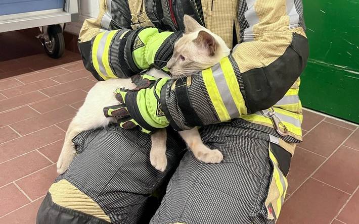 Carlos war augenscheinlich unverletzt und ließ sich ruhig in eine Transportbox setzen. Die Feuerwehr brachte ihn zur Wache, wo das Ordnungsamt ihn übernahm. Da er gechippt und registriert war, konnte sein Besitzer schnell ermittelt werden. Inzwischen ist der Kater wieder wohlbehalten zuhause. Der gesamte Einsatz dauerte etwa 45 Minuten. Mehr Bilder von der Rettung: