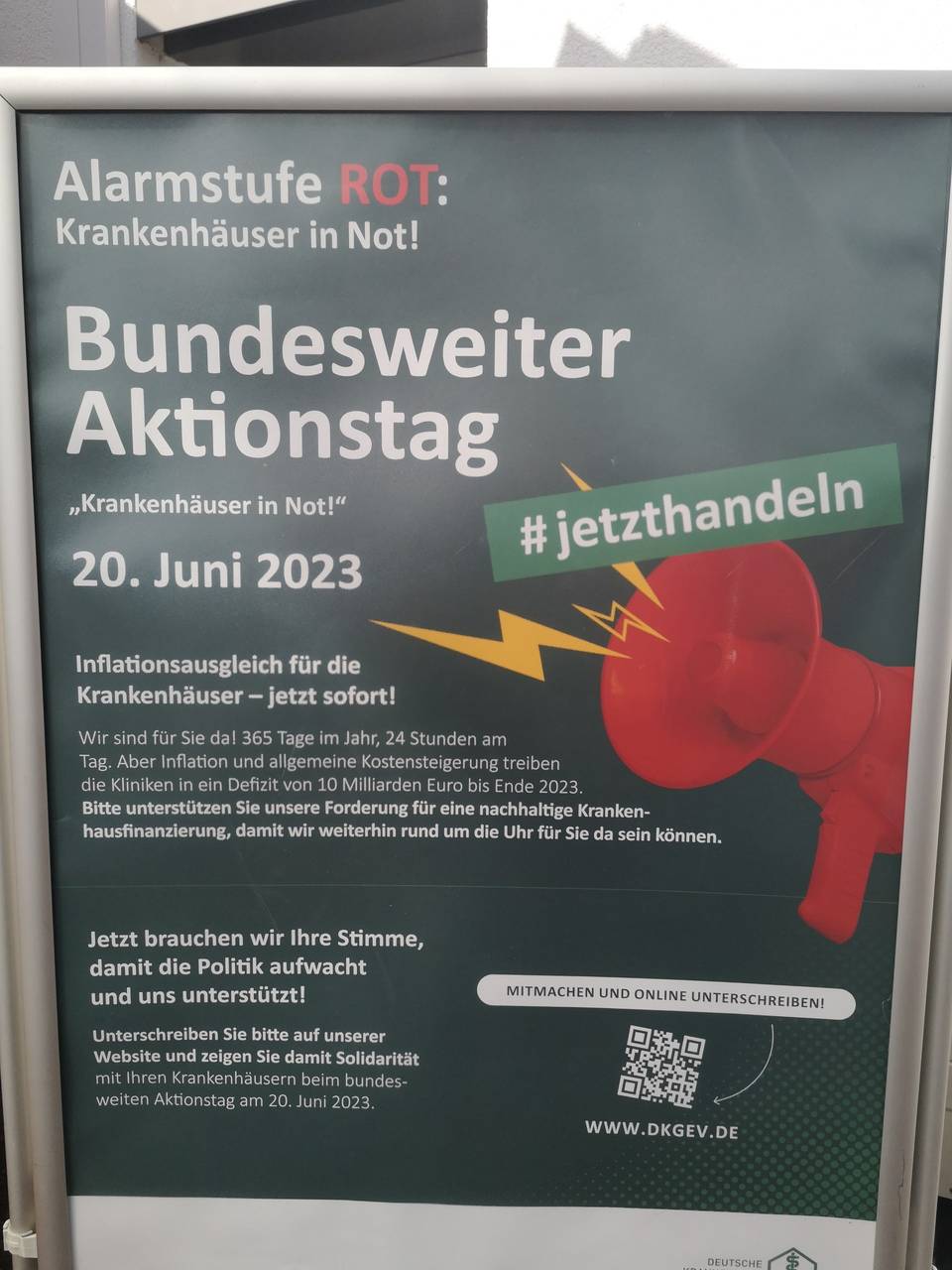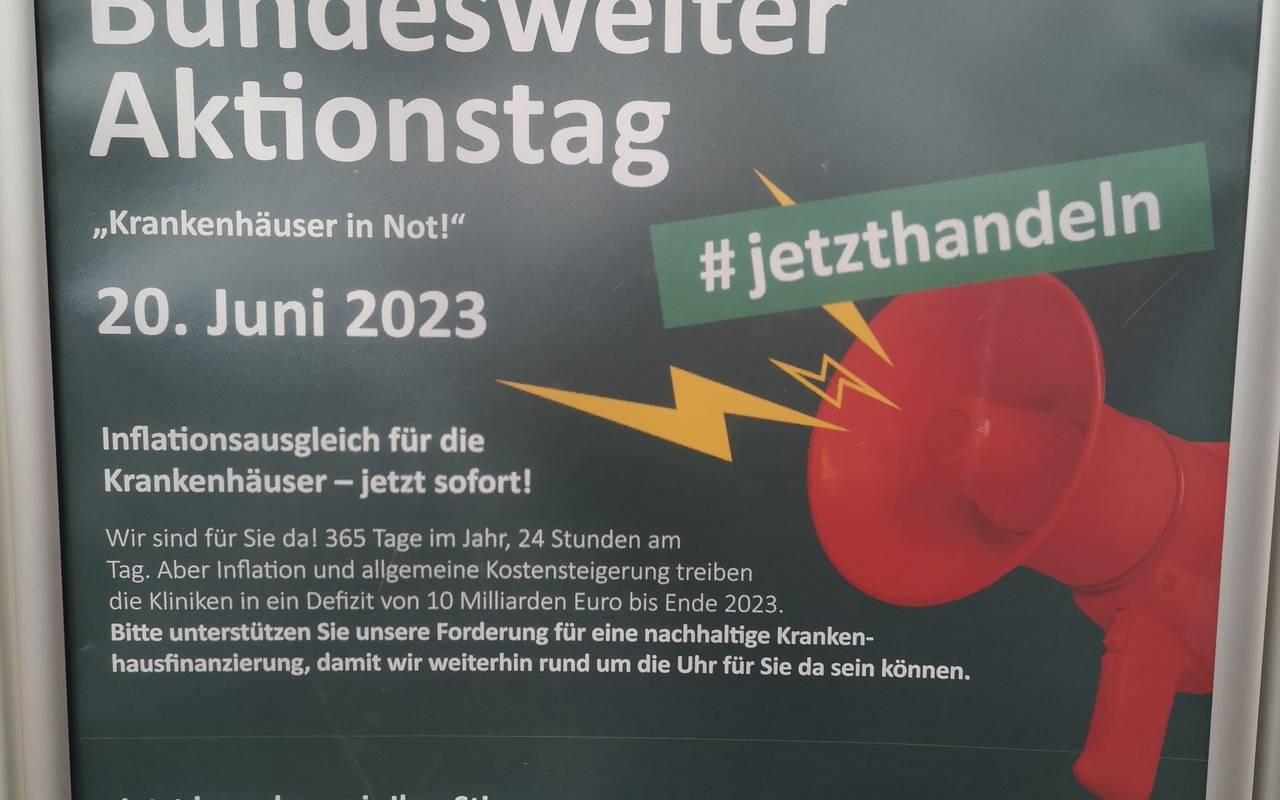 Deutschlands Krankenhäuser gehen finanziell am Stock. Zehn Milliarden Euro Defizit werden bis Ende 2023 erwartet, davon allein in NRW zwei Milliarden. Gründe seien Unterfinanzierung, Inflation und allgemeine Kostensteigerungen. Mit dem heutigen bundesweiten Aktionstag machen die deutschen Krankenhäuser auf ihre ernste wirtschaftliche Lage aufmerksam. Sie fordern von der Bundesregierung einen umfassenden finanziellen Ausgleich.