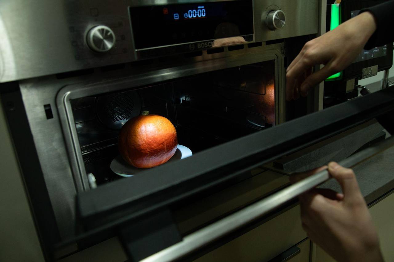Für zweieinhalb Minuten bleibt der Kürbis bei höchster Stufe in der Mikrowelle.© Christin Klose/dpa-tmn