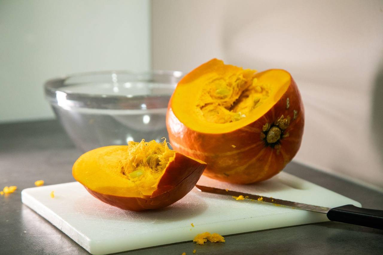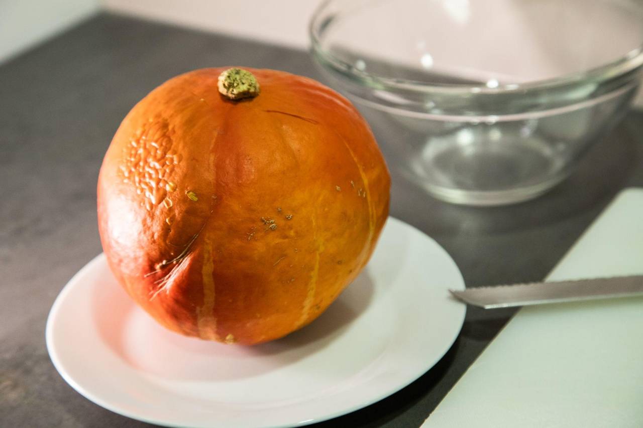 Und so geht's: Den Kürbis für zweieinhalb Minuten bei höchster Stufe in die Mikrowelle legen. Die erhitzte Frucht anschließend wieder herausnehmen und schneiden.