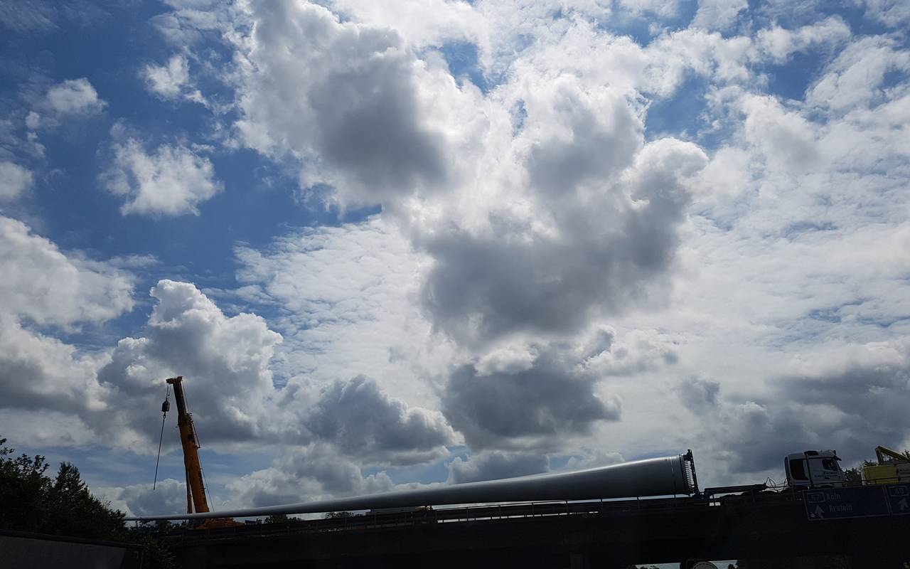 Fast 12 Stunden gab es gestern Probleme im Kreuz Moers. Der 70-Meter lange Flügel eines Windrades für einen Windpark in Kerken musste umgeladen werden, nachdem der Transportschlepper einen Achsbruch hatte. Zu dem Zeitpunkt befand sich der Laster mit Ladung in de Abfahrt zur A40 Richtung Venlo. Um 13 Uhr war der Flügel geborgen um 15 Uhr die Autobahn wieder frei. Vor allem auf der A57 gab es entlang Hülsdonk lange Rückstaus.
