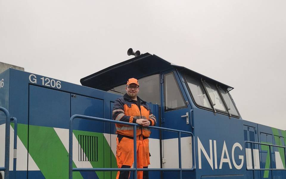 Mathias Schmiegelt ist Lokführer mit Leib und Seele. Er hat den Beruf von der Pieke auf gelernt und setzt auch in Zukunft auf die Bahn. Aus seiner Sicht müssten noch viel mehr Güter auf die Schiene, schon alleine aus Gründen der Wirtschaftlichkeit und Nachhaltigkeit. Ein Zug ersetzt mehr als vierzig Lkw. Arbeit ist genug da, die NIAG sucht noch Lokführer. Auch Umschulungen sind in der eigenen NIAG Bildungsstätte möglich.