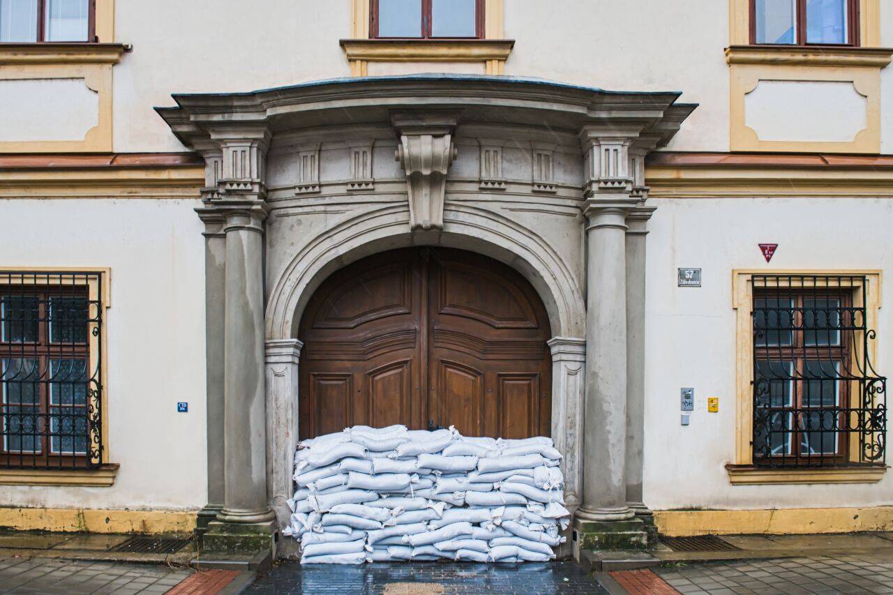 Sandsäcke schützen ein Eingangstor auf der Lazaretní Straße vor dem Hochwasser.