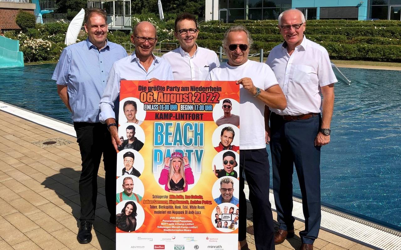 Musik, Wasser und gutes Wetter sind drei wichtige Teile für eine richtige Beach Party. Alle drei Dinge sind am Samstag (6. August) im Panoramabad Pappelsee in Kamp-Lintfort vorhaben. Nach zwei Jahren ohne Beachparty kehrt die traditionsreiche Veranstaltung dieses Jahr wieder zurück. Unverändert bleibt das Programm auf der Bühne mit einem Mix aus Schlager und Party-Hits. Auf der Bühne stehen am Samstag unter anderem Mia Julia, Tobee, Jörg Bausch und Julian Sommer. Um 16 Uhr öffnet das Bad für die Partygäste die Türen, eine Stunde später startet das Musikprogramm.