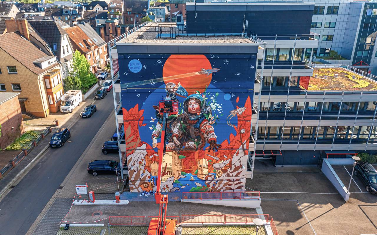 Ein Wandbild aus Moers steht neben 35 weiteren Bildern aktuell zur Wahl des „Best Mural oft the World 2023“. Das 16 Meter hohe und 13 Meter breite Kunstwerk von zwei Spaniern wurde auf das Gebäude der Sparkassen-Hauptstelle gemalt. Es zeigt ein Zukunftsbild mit Astronauten. Die Idee dazu stammt von Schülern aus Moers. Bis Ende Januar kann jeder online dafür abstimmen. Der Wettbewerb für das „Beste Wandbild 2023 weltweit“ wird von der größten internationalen Plattform für Kunst an öffentlichen Orten ausgerichtet. Hier geht es zum Voting.