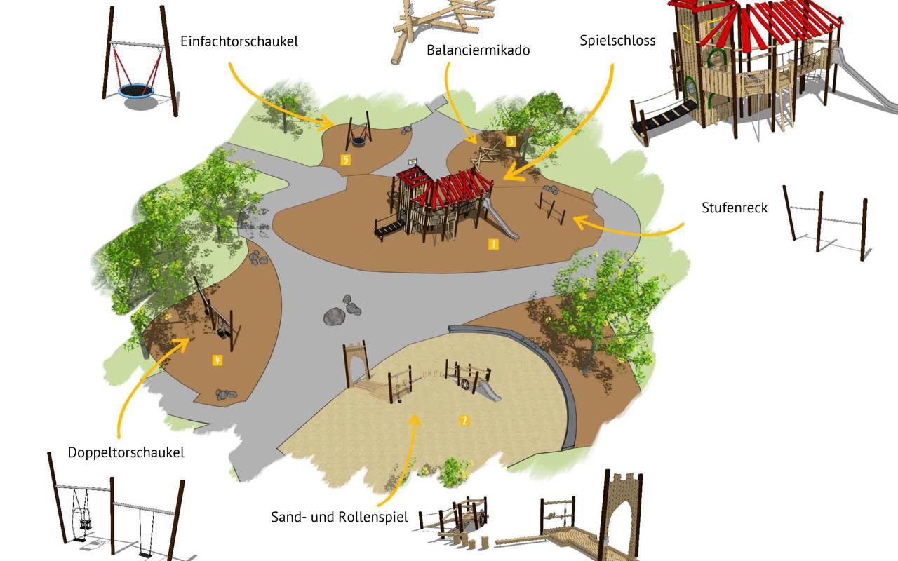 Der Spielplatz soll in mehrere Bereiche eingeteilt werden. Herzstück wird ein Kletterturm in Form des Moerser Schlosses - mit Rutsche, Kletterwand und Wackelsteg. Ein weiterer Bereich ist für Sand- und Rollenspiele vorgesehen - mit kleineren Geräten. Und es soll mehrere Schaukeln für unterschiedliche Altersgruppen geben - darunter auch eine Eltern-Kindschaukel.