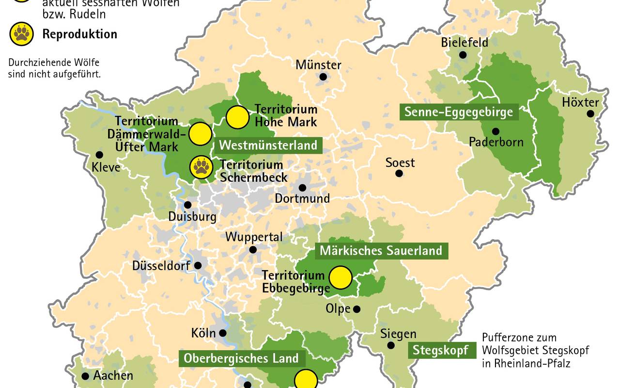 Im Territorium Schermbeck wurde der Nachwuchs bestätigt. Dämmerwald/Üfter Mark wird aktuell nur von einem einzelnen Wolfsrüden bewohnt. Das Gebiet Hohe Mark hat sich hingegen aufgelöst. Der BUND erklärt, dass die Größe eines Territoriums etwa 200 Quadratkilometer beträgt – das entspricht der durchschnittlichen Reviergröße eines Wolfsrudels.