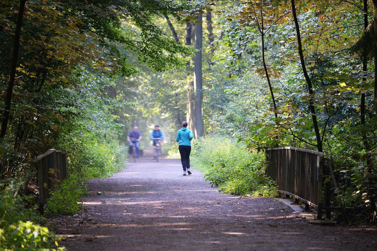 In 5,3 Kilometern geht es zwischen vielen Bäumen um den Dinslakener Rotbachsee. Meist laufen wir auf Schotter oder festen Waldwegen. Gut zu wissen: Schwimmen darf man hier nicht, der Rotbachsee dient als Talsperre für den Hochwasserschutz.Heiko Kempen / WAZ Fotopool