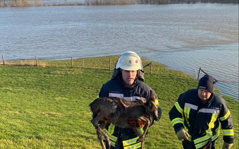 In Xanten hat die Feuerwehr heute ein Reh gerettet, das wahrscheinlich sonst ertrunken wäre. Das Tier war im Schlamm stecken geblieben und durch das Hochwasser auch teilweise mit dem Kopf unter Wasser, hieß es.