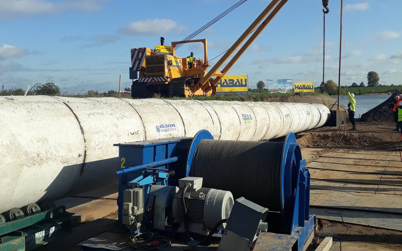 Es war Kaiserwetter bei der Dükertaufe heute mittag in Rheinberg. Der Düker ist 525 Meter langer Rohrleitungsabschnitt mit dem die Gaspipeline ZEELINK zur Stunde den Rhein von Borth in Richtung Voerde - Ork durchquert. Er hat das rechte Rheinufer um 17 Uhr 13 erreicht. Die Seilwinde hatte eine Zugkraft von 200 Tonnen. Die Leitung ist dreieinhalb Meter unter der Flußsohle verlegt. Das Rohr hat eine 19,5 mm dicke hochfeste Stahlummantelung, darum zusätzlich mit 4mm Kunststoff und darum nochmal mit 26 Zentimenter Beton umhüllt. Die Rheinunterquerung war die größte Herausforderung der Zeelink - Pipeline.