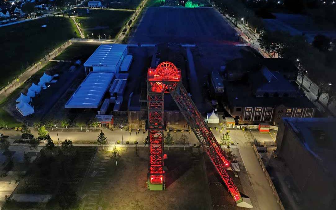 In Kamp-Lintfort leuchtet der Schacht 2 jetzt nachts. Er wird in unterschiedlichen Farben angestrahlt und soll zum Wahrzeichen der Stadt werden.