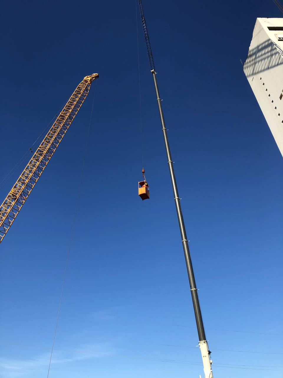 Der Stahlbeton-Förderturm wurde 1962 gebaut - ein Jahr später ist er für die Steinkohleförderung erstmals eingesetzt worden. Nachdem die Schachtanlage Rossenray Ende 2012 endgültig stillgelegt wurde, läuft seit Oktober 2019 der Rückbau des Förderturms. Für die Arbeiten auf dem Dach des Turms, musste zunächst ein 21 Tonnen schwerer Käfig angefertigt werden. Darin wurde der 26 Tonnen schwere Meißelbagger befestigt. Der wird in den nächsten Wochen täglich bis auf das Schachtturmdach gehoben. Der Baggerfahrer wird separat hochgehoben. Das Ganze soll etwa 15 Minuten dauern. Bis auf 70 Meter meißelt der Bagger den Turm nach und nach ab - etwa 10.000 Kubikmeter Bau- und Betonschutt fallen dabei an. Dann kommt die klassische Abrissbirne zum Einsatz. Wenn alles gut geht und das Wetter mitspielt, ist der Rückbau Ende 2020 abgeschlossen - dann soll auf die 13 Hektar große Fläche der Schachtanlage Rossenray zu einer Gewerbe- und Industriefläche werden.