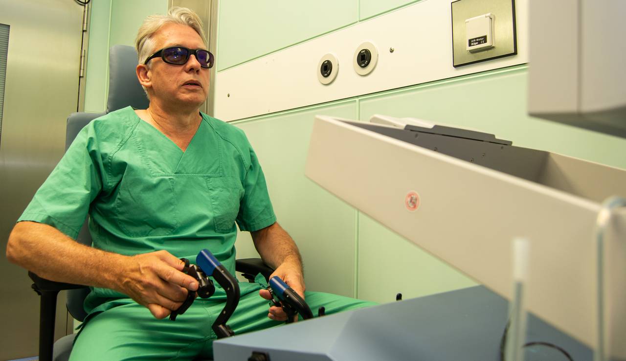 Der "Robbi" wird mit den Augen gesteuert, die gleiche Technik verwenden die Piloten in den amerikanischen "Apache" - Kampfhubschraubern. Die Kamera steuert automatisch in die Richtung, in die der Chirug schaut. Das macht er zusätzlich durch eine 3-D-Brille, um den perfekten räumlichen Blick auf das Geschehen zu haben.
